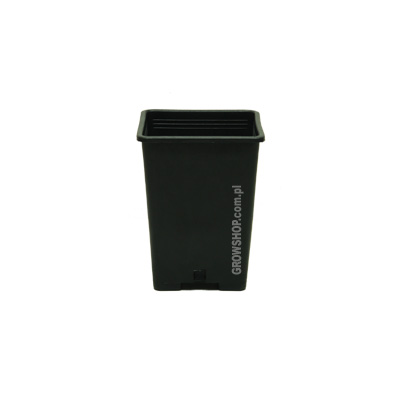 Doniczka kwadratowa o pojemności 2,5 litra wykonana z grubego, sztywnego tworzywa sztucznego.