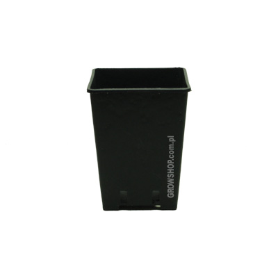 Doniczka kwadratowa o pojemności 3,5 litra wykonana z grubego, sztywnego tworzywa sztucznego.