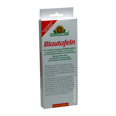 OPIS PRODUKTU Niebieskie tablice lepowe służą do wczesnego rozpoznawania i wyłapywania wciornastek (Thrips). Pułapki owadobójcze eliminują insekty i powstrzymują je przed złożeniem jaj. Są bezzapachowe i pokryte specjalnym lepem, nie wysychają w wysokich temperaturach. Skuteczne również podczas kontaktu w wodą. Owady zwabione niebieską barwą wpadają w pułapkę.